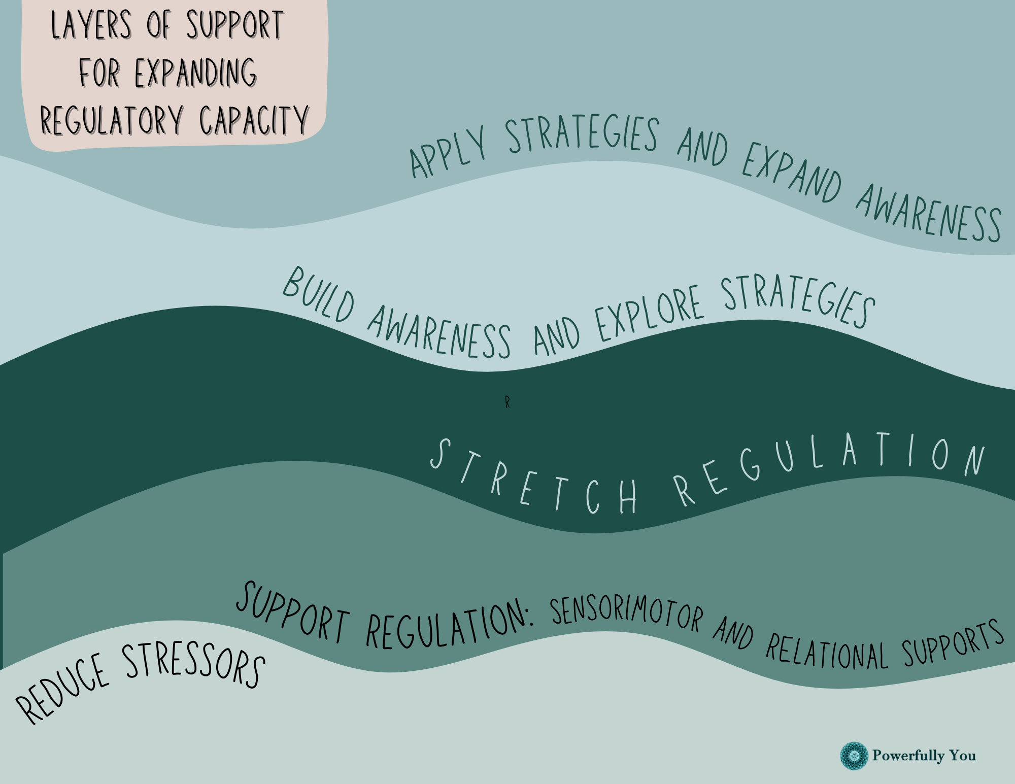 So what are the layers of support for expanding regulatory capacity? I have come up with the categories of: reducing stressors, supporting regulation with sensorimotor and relational supports, stretching regulation, building awareness and exploring strategies, and then applying strategies and expanding awareness.